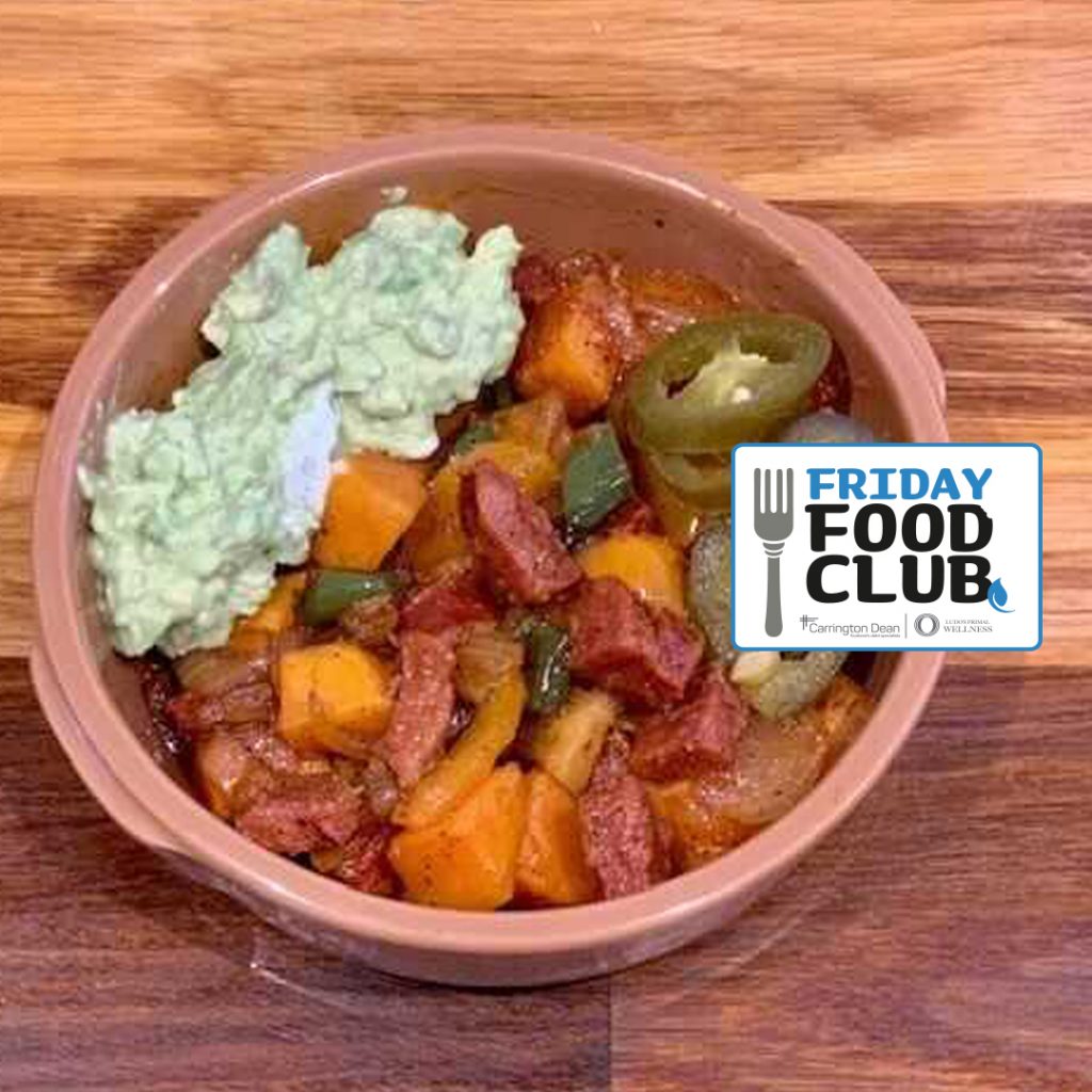 In this week’s Friday Food Club, the team at Ludo’s Primal Wellness has put together a recipe for a sweet potato chorizo hash with eggs and avocado crema – a Mexican-style cream that’s great for dolloping over spicy dishes.